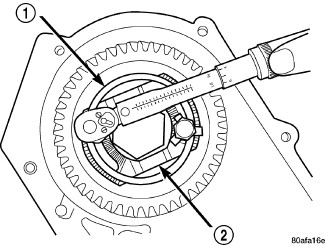 59. Using the Turning Torque Tool 9735 (1) and an inch pound torque wrench (2) check the differential turning torque, it should be 10 to 22 in-lbs (drag). If turning torque is more than 22 in-lbs (drag) decrease shim size behind the end cover and recheck. If turning torque is less than 10 in-lbs (drag) increase shim size.