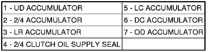 102. Install all six accumulators (1, 2, 3, 5, 6 and 7) into case along with the accumulator return springs.