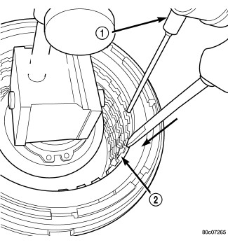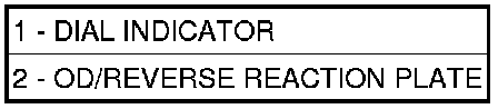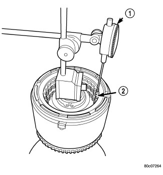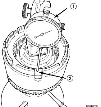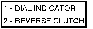 41. Using moderate pressure, press down and hold (near indicator) reverse clutch disc (2) with screwdriver or suitable tool and zero dial indicator (1). When releasing pressure, indicator should advance (0.005-0.010 in.) as clutch pack relaxes.