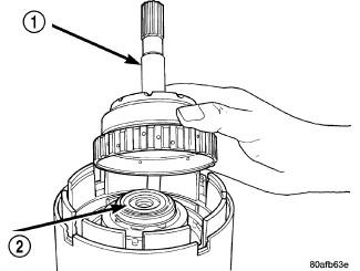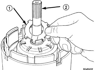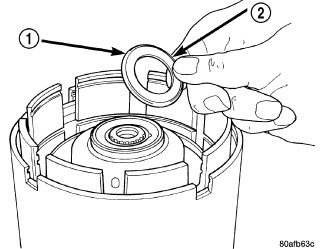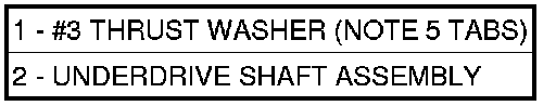47. Install the number three thrust washer (1) to the underdrive shaft assembly (2). Be sure five tabs are seated properly.