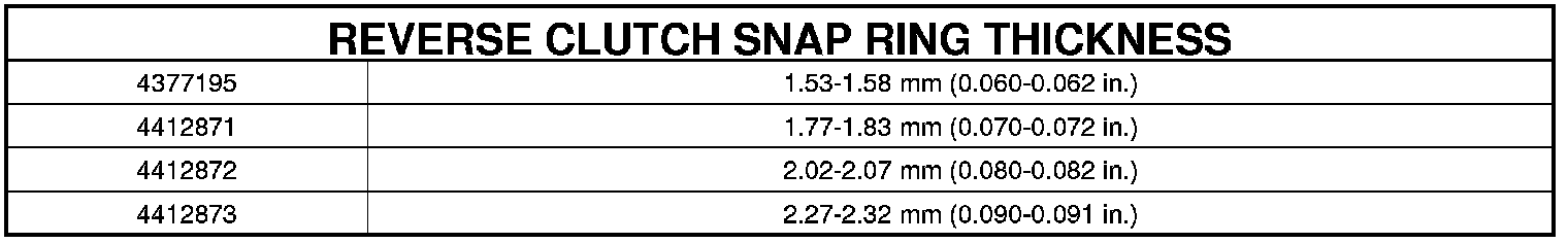 43. Take average of four measurements and compare with reverse clutch pack clearance specification. The reverse clutch pack clearance is 0.76-1.245 mm (0.030-0.049 in.). Select the proper reverse clutch snap ring to achieve specifications: