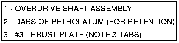 48. Install the number three thrust plate (3) (note 3 tabs) to the bottom of the overdrive shaft assembly (1). Retain with petrolatum or transmission assembly gel (2).