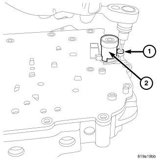 8. Install the bolt (1) at the pressure control solenoid (2) and tighten to 6 Nm (50 in. lbs.).