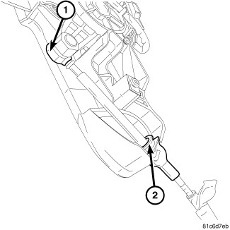 5. Install the gear shift cable (1) to the shifter. Make sure the lock tab (2) on the gearshift cable is fully seated.