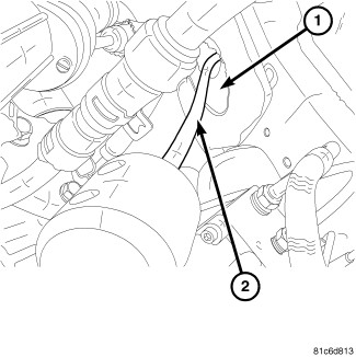 1. Install the gearshift cable (2) through the bulkhead (1) from the passenger compartment.