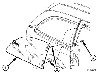 2. Install the two hinge retaining nuts (3) and washers (2) at the C-pillar.