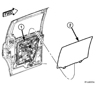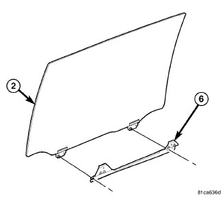 1. Install the sliding door glass (2) into the window opening. Make sure the glass is properly positioned within the glass run.