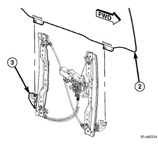 3. Working through the close-out plugs in the door module assembly, carefully engage the sliding door glass into the two plastic liftplates (3) located on the window regulator and secure glass attach nuts.