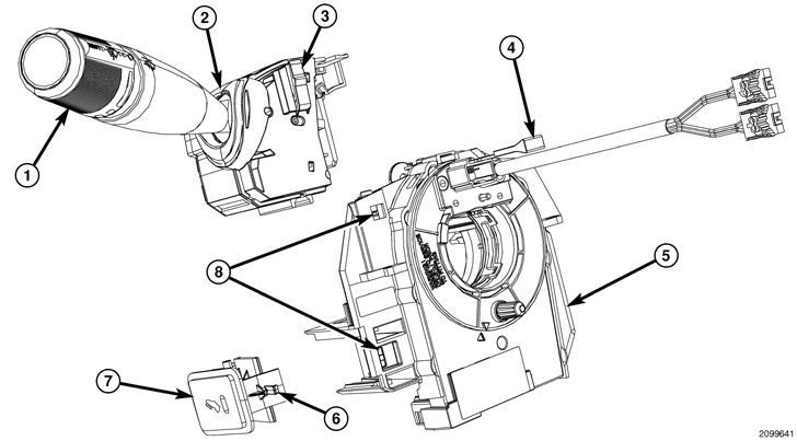 The multi-function switch cannot be adjusted or repaired. If any function of the switch is ineffective, or if the switch is damaged, the entire switch unit must be replaced. The clockspring with the multi-function switch mounting bracket and Steering Angle Sensor/SAS, the multi-function switch (with the internal SCM) and the optional adjustable pedal switch (7) are each available for separate service replacement.