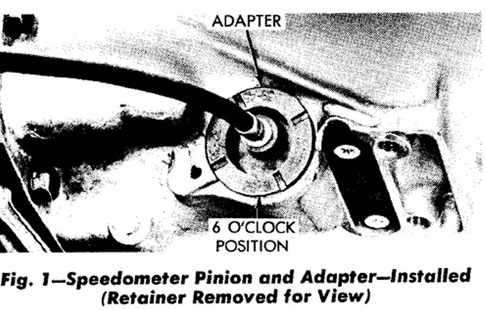 (3) Remove speedometer pinion and adapter assembly (Fig. 1). Drain approximately two quarts of fluid from the transmission.