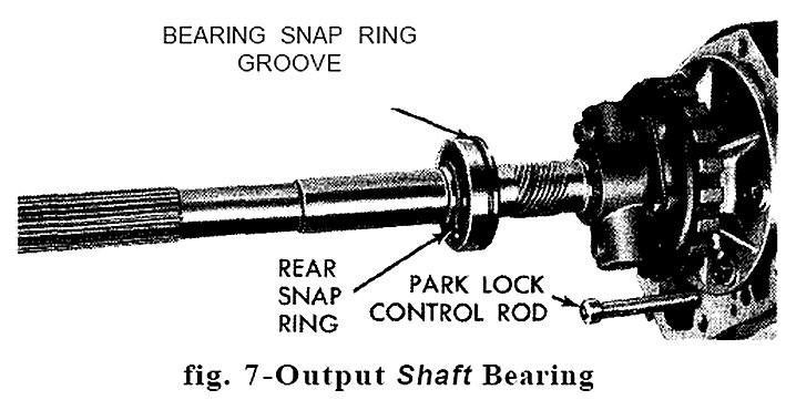 6. Remove two screws, plate and gasket from bottom of extension housing mounting pad, then spread snap ring from output shaft bearing, Fig. 7. With snap ring spread as far as possible, Carefully pull extension housing rearward, to remove parking lock control rod knob past the parking sprag, than remove the housing.
