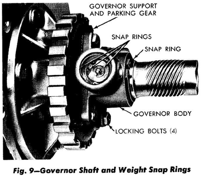 (2) Carefully pry snap ring from weight end of governor valve shaft (Fig. 9). Slide valve and shaft assembly out of governor body.