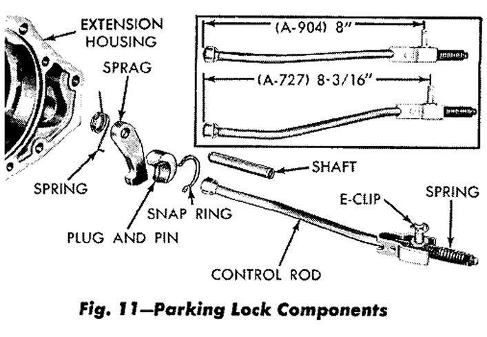 (2) Slide shaft out of extension housing to remove(2) Slide shaft out of extension housing to remove the parking sprag and spring (Fig. 11). Remove snap ring and slide the reaction plug and pin assembly out of the housing.