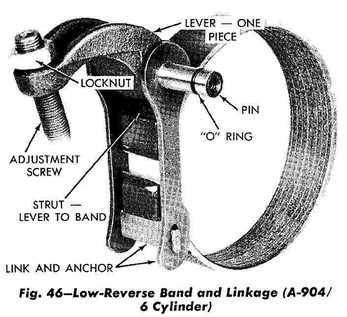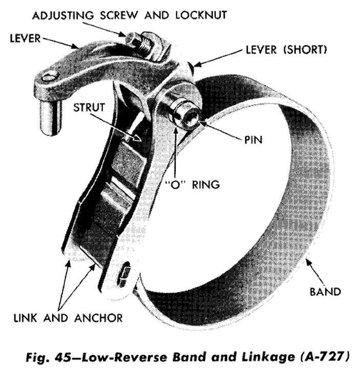 (3) Position rear band in the case, install short strut, then connect long link and anchor to the band. Screw in band adjuster just enough to hold strut in place. Install low-reverse drum. Be sure long link and anchor assembly is installed as shown in Figure 42, to provide running clearance for the low and reverse drum.