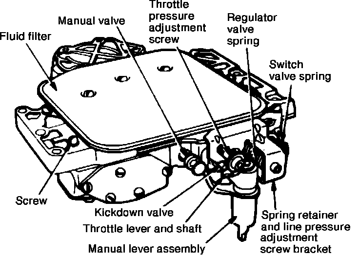 3. Place a drain pan under transmission and remove the ten valve body to transmission bolts. Hold valve body in place while removing bolts.