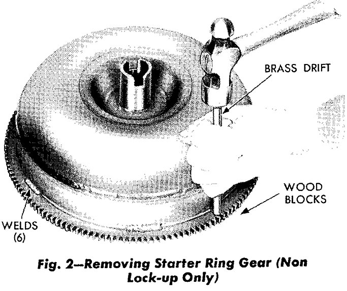 (3) Support converter on front cover, adjacent to the lugs with blocks of wood to prevent altering lug position. The converter must not rest on the front cover hub during this operation. Using a blunt chisel or drift and a hammer, tap downward on ring gear near welded areas to break any remaining weld material (Fig. 2). Tap around ring gear until it comes off the converter.
