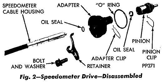 (1) Remove bolt and retainer securing speedometer pinion adapter in the extension housing (Fig. 1).