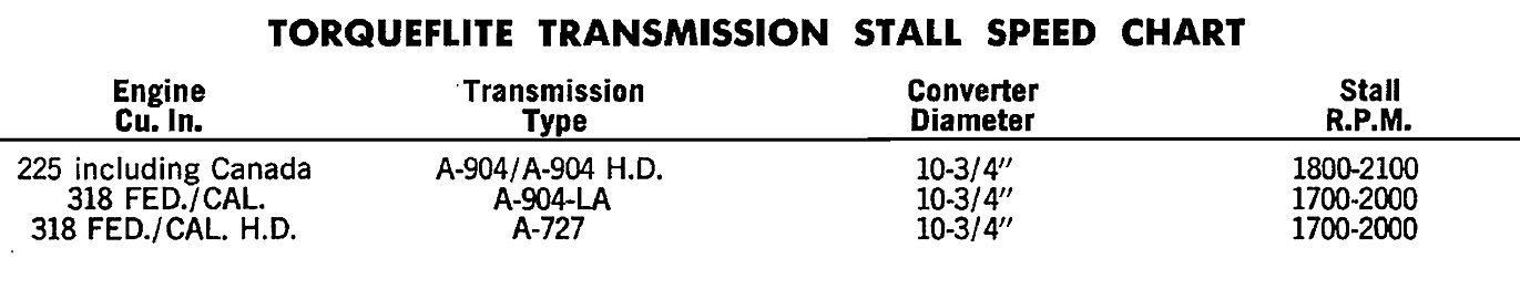 Low stall speeds, with a properly tuned engine, indicate torque converter stator clutch problems. A road test will be necessary to identify the exact problem. If stall speeds are 250-350 rpm below specification, and the vehicle operates properly at highway speeds, but has poor through-gear acceleration, the stator overrunning clutch is slipping (lock-up and non lockup torque converters).