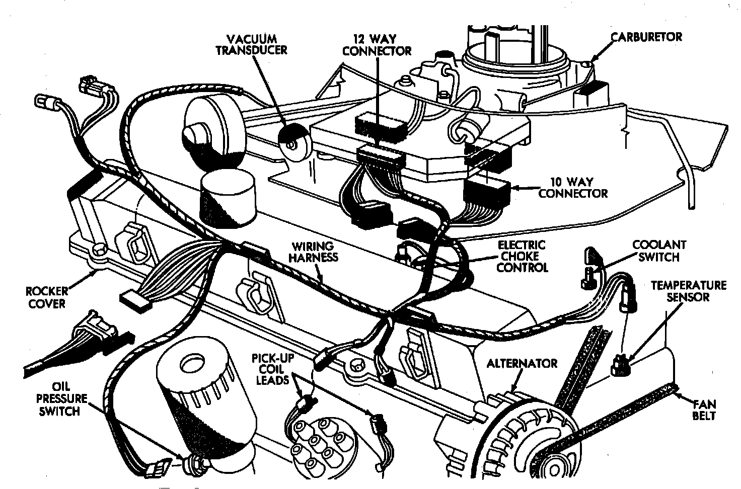 On six cylinder engines the coolant switch is located on the front of the cylinder head. Fig. 5A It operates the same as for the four cylinder engine. In addition, when the engine temperature reaches 150 degrees F., the computer will switch the air pump injection from upstream to downstream into the exhaust system and will allow the charcoal canister to purge.