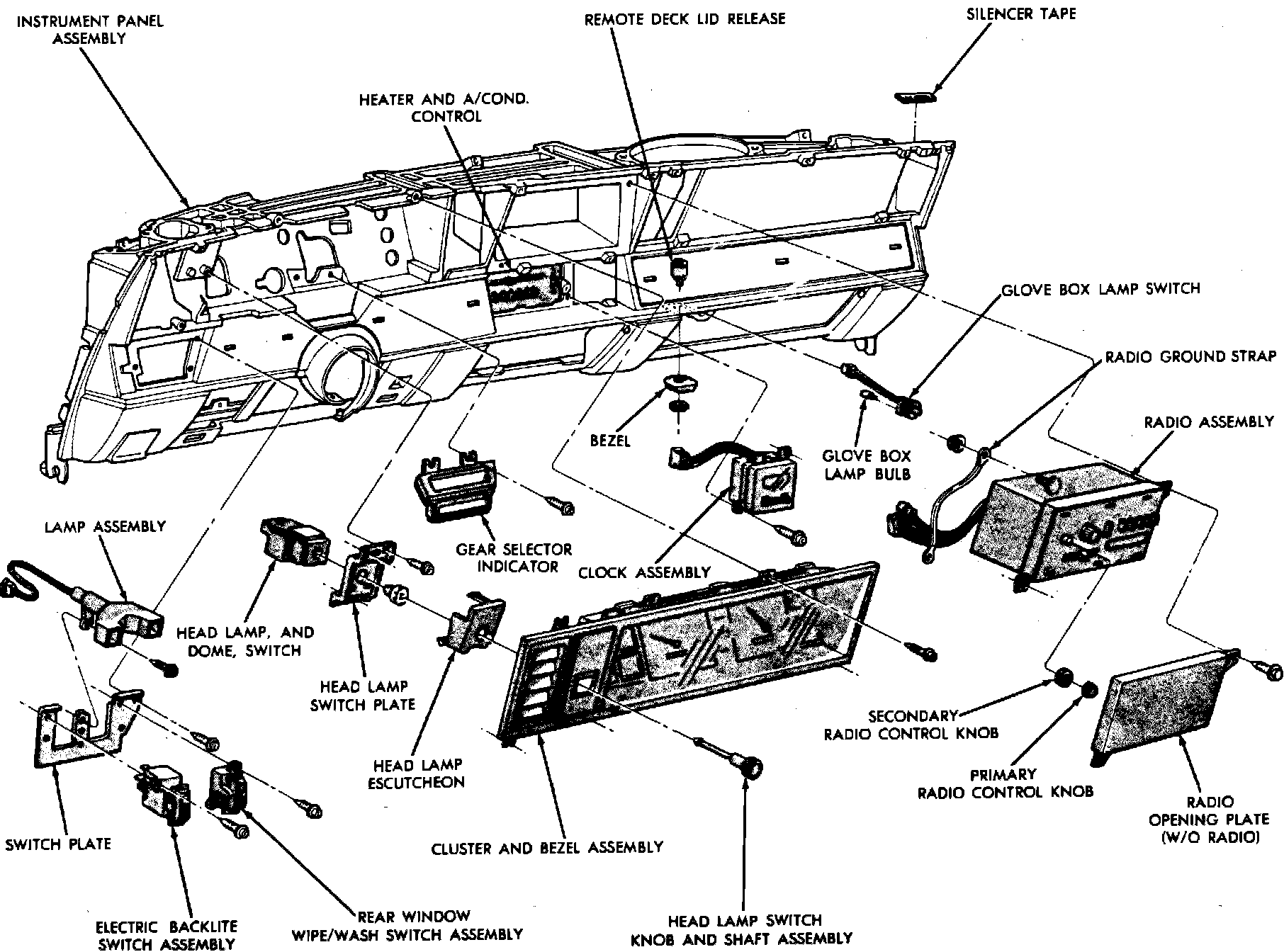 Fig. 12 Instrument panel, exploded view (Typical). 1982---84 Aries & Reliant; 1982---83 LeBaron & 400; 1983 E Class, Executive, New Yorker & 600: