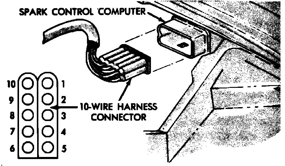 18. If continuity is present, turn ignition On and check for voltage between cavity and 10 of 10-wire connector. If battery voltage is present, replace Spark Control Computer. If battery voltage is not present, check for proper computer ground circuit connection and repair as necessary.