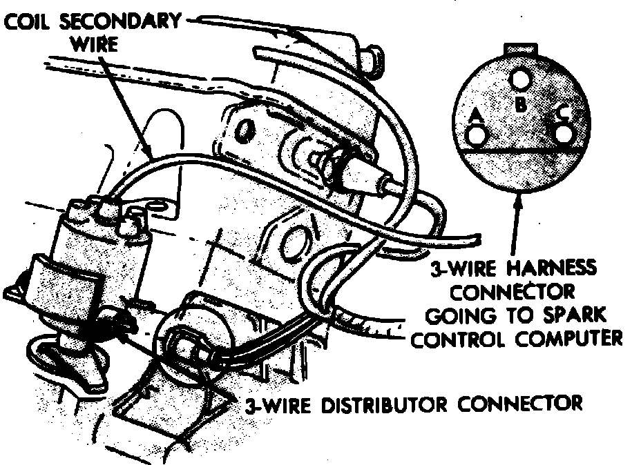 12. Reconnect 10-wire connector into Spark Control Computer, turn ignition On and hold coil wire 1/4 inch from ground. Disconnect distributor electrical connector and momentarily connect jumper wire between terminals A and C of connector several times, Fig. 3. Spark should be observed at coil wire.
