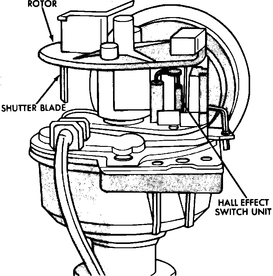13. If spark is present at coil wire, but engine will not start, replace pickup assembly and on 1984-85 models, perform rotor test as described in step 19. When replacing Hall Effect pickup assembly on 1984-85 models, ensure rotor shutter blades are grounded, Fig. 4. Connect one lead of suitable ohmmeter to shutter blade and other lead to ground. If continuity is not present, press downward on rotor shaft and recheck continuity. If continuity is still not present, replace rotor. Check to ensure that new rotor is marked ESA on top. Do not start engine until continuity has been obtained.