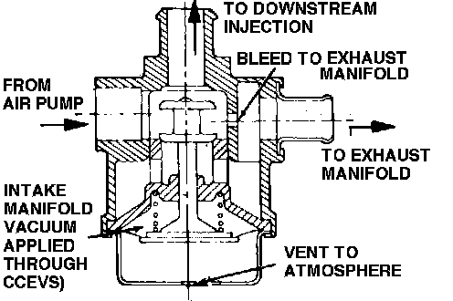 This switch, Figs. 4 and 6, provides manifold vacuum to the air switching system after a cold engine start until coolant temperature reaches a predetermined level. After the coolant temperature reaches this level, the switch closes and vacuum is cut off from the air switching system. The CCEVS/CVSCO is mounted in the thermostat housing.