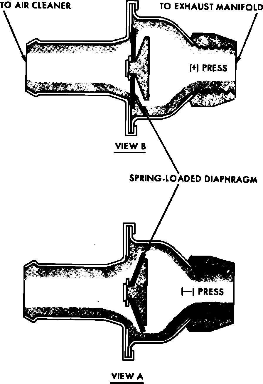 The valve, Fig. 6, in this system uses exhaust pressure pulsations to draw air into the exhaust system to reduce CO and HC emissions. It draws fresh air from the ``clean'' side of the air cleaner and past a one-way spring loaded diaphragm. The diaphragm opens to permit fresh air to mix with the exhaust gases during negative pressure (vacuum) pulses. When the pressure is positive, the diaphragm closes and no exhaust gases are allowed to flow past the valve. The aspirator valve works most efficiently at idle and slightly above idle when the negative pulses are maximum. At higher engine speeds, the aspirator valve remains closed.