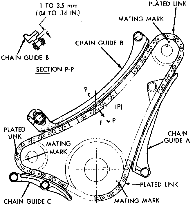 d. Adjust position of chain guide ``B'' so when the chain is pulled in direction of arrow ``F,'' clearance between chain guide ``B'' and chain links will be .04 - .14 inch. Tighten chain guide ``B'' mounting screws.