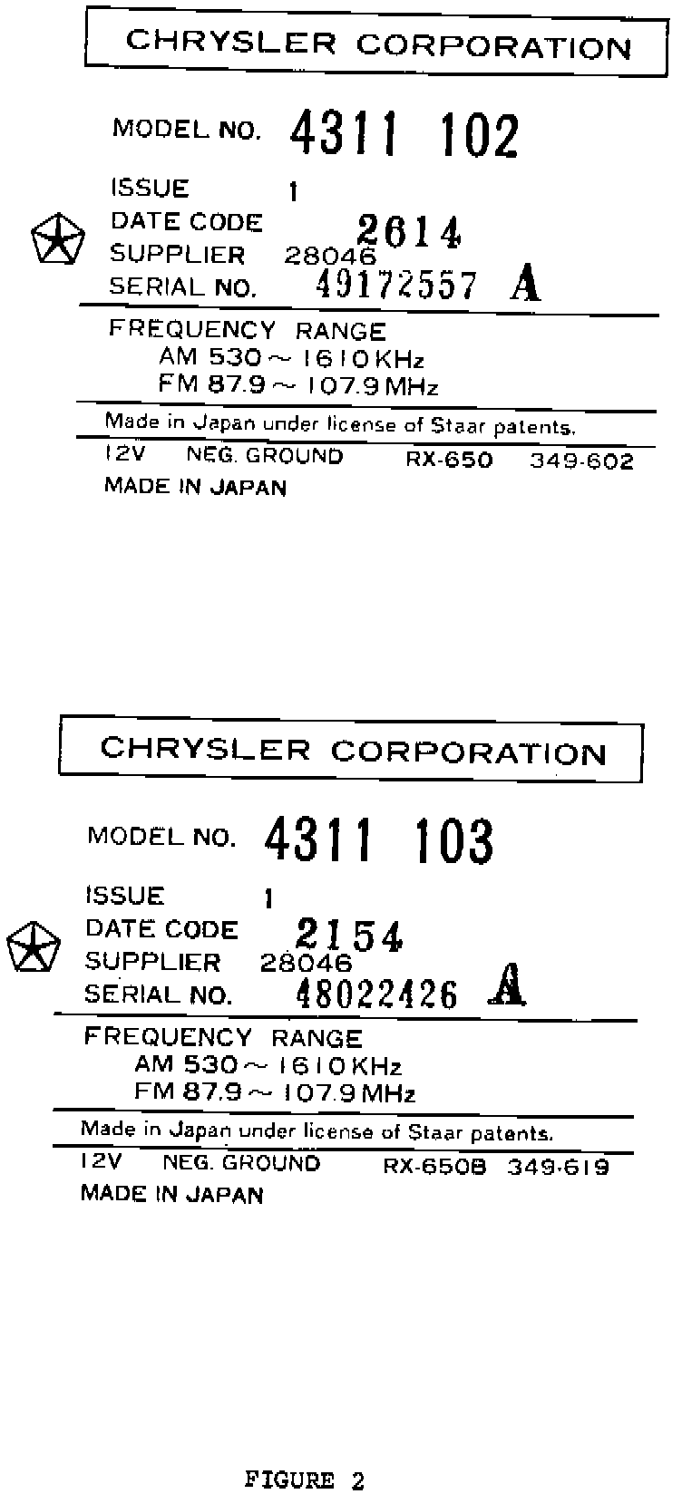 Warranty service for Chrysler manufactured radios is handled through Chrysler Authorized Service Depots. Chrysler manufactured radios are identified by the label shown in Figure 1 affixed to the radio cover. Warranty service for Mitsubishi manufactured radios is handled through Mitsubishi Authorized Service Depots. The ultimate sound radio sales code RAY can be identified by the model numbers 4311102 and 4311103 shown in Figure 2.