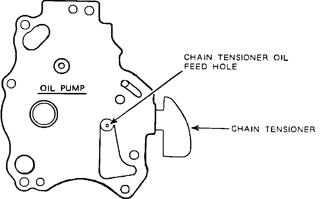 1. Blocked oil feed hole to the timing chain hydraulic chain tensioner located in the oil pump housing (Figure 2). Blockage occurs when a section of the oil pump mounting gasket collapses into the channel in the pump cover which directs oil from the main oil gallery in the block to the chain tensioner feed hole.