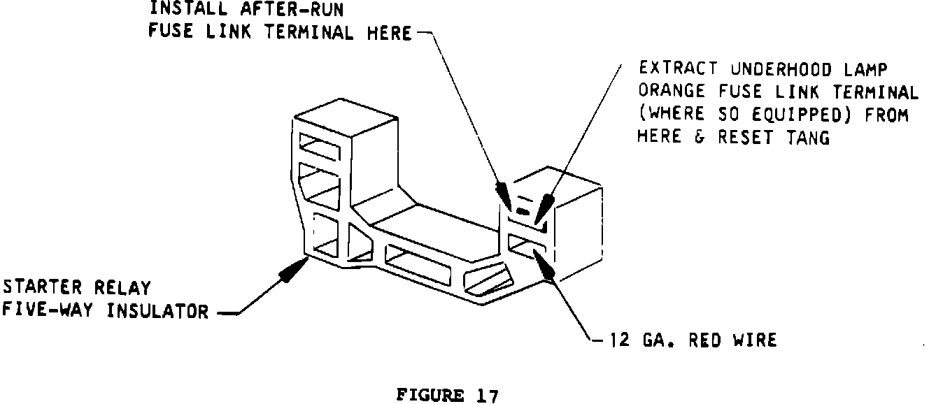 12. Snap bare terminal of after-run harness (crimped to fuse link) into starter relay insulator (cavity next to 12 GA red wire) (Figure 17). Reconnect starter relay connector to starter relay.