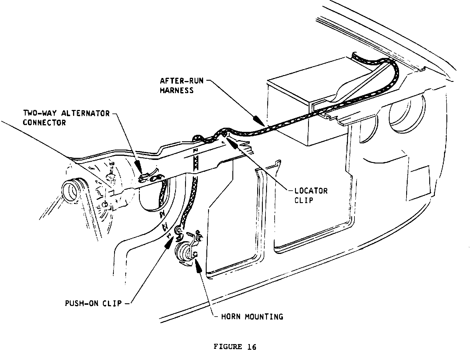 9. Route remaining wiring along left side of battery into radiator yoke trough past the radiator and down rear face of yoke forward of the alternator. Snap locator clip into hole in yoke trough over the right half of the radiator. Seat push-on clip over horn mounting bolt on rear face of yoke (Figure 16).