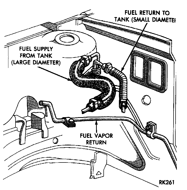 6. On vehicles without fuel injection, disconnect fuel supply hose and connect either a portable holding tank or a siphon hose to the metal fuel supply tube at the right front shock tower. Drain fuel tank dry into holding tank or a properly identified "gasoline" safety container.