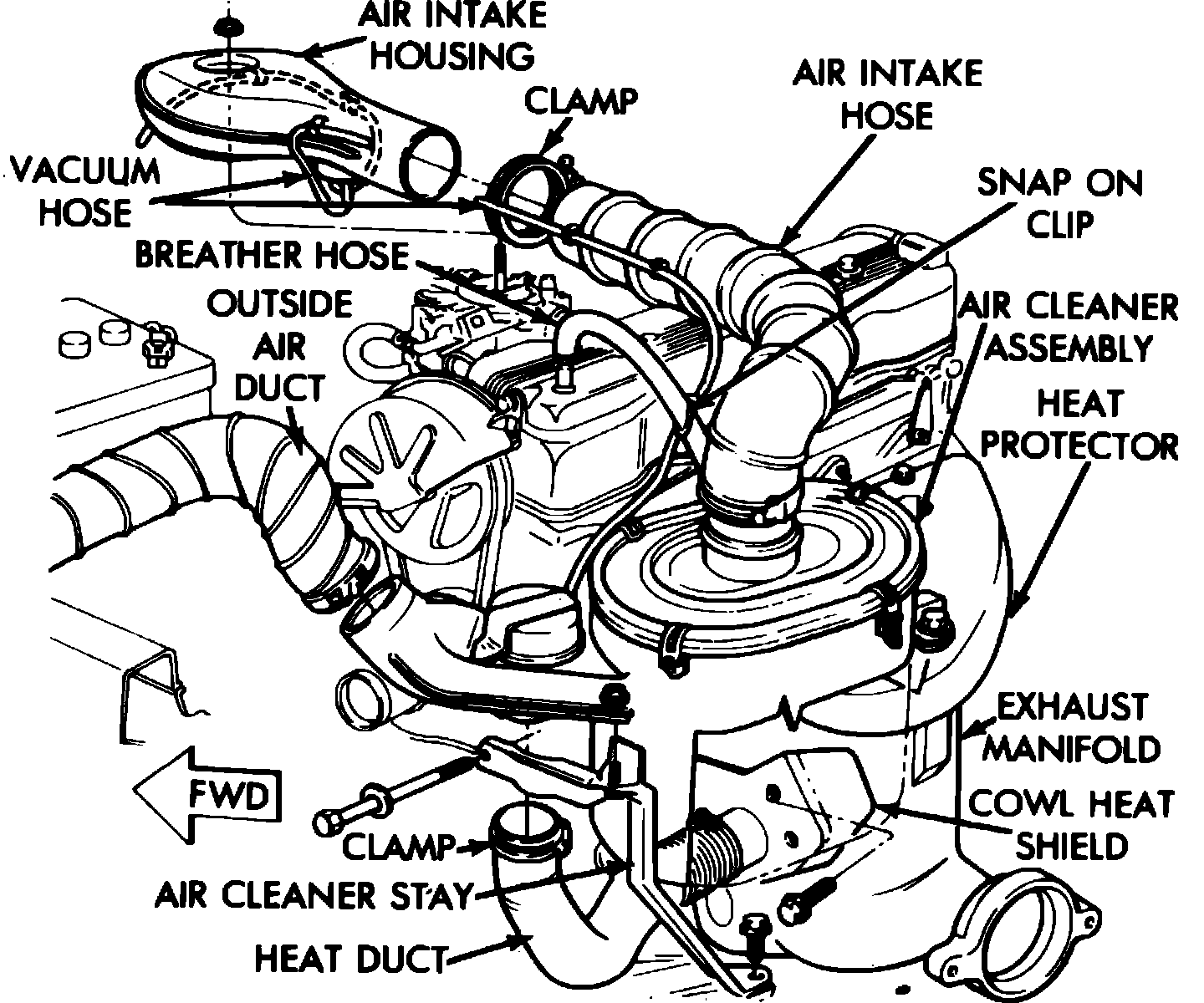 During engine warm-up, air is heated by a shroud surrounding the exhaust manifold, then the air is piped to the air cleaner snorkel and into the carburetor/EFI. The vacuum diaphragm controls the air control valve which is closed to outside air. Therefore all air entering the carburetor/EFI is heated.
