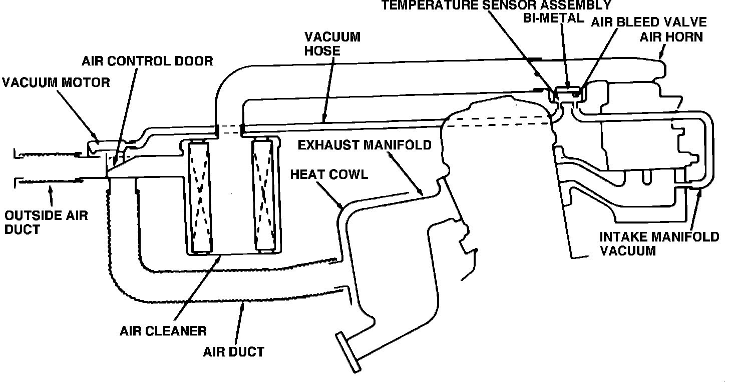 During wide-open throttle operation or at any time engine vacuum is below 4-6 inches Hg, the hot air duct is closed off allowing only cold air to enter the carburetor/EFI.