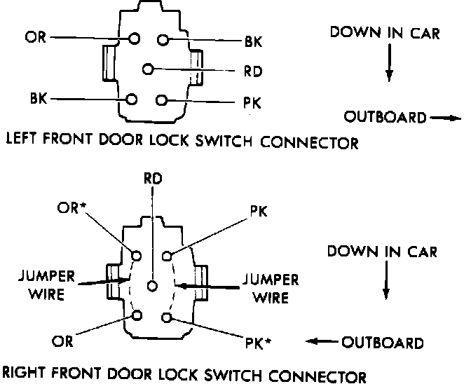 1. Remove the right door switch from the door panel and disconnect the wires from the back of the switch. Connect jumper wires as indicated to the right door wiring harness. These jumper wires take the place of the switch in the inactive position. Operate the door locks using the left door switch.