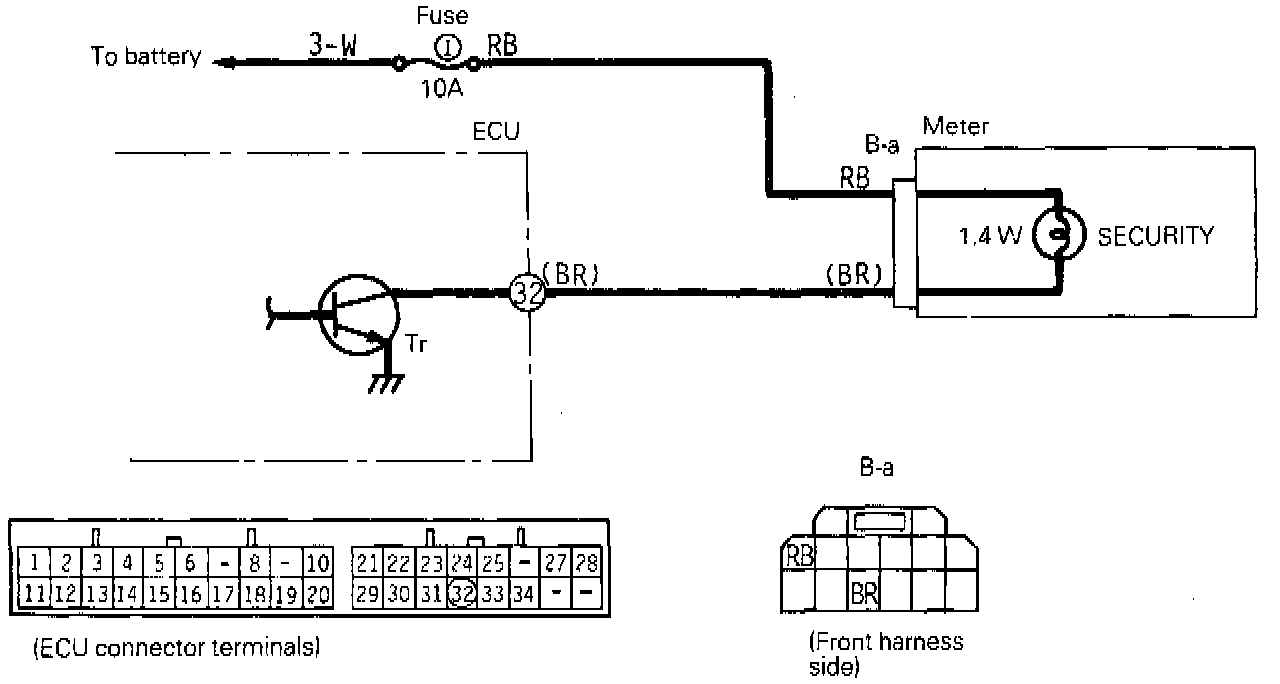 If all doors are in locked state after key locking or key-less locking, the electronic control unit transistor is turned ON and the security light comes on.