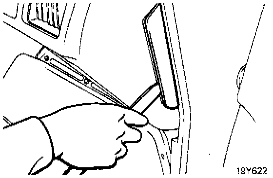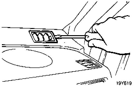 Insert a screwdriver from the door glass side, and twist and pry the side defroster upper grille forward to pull it out.