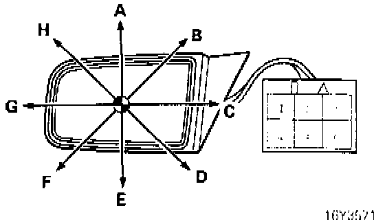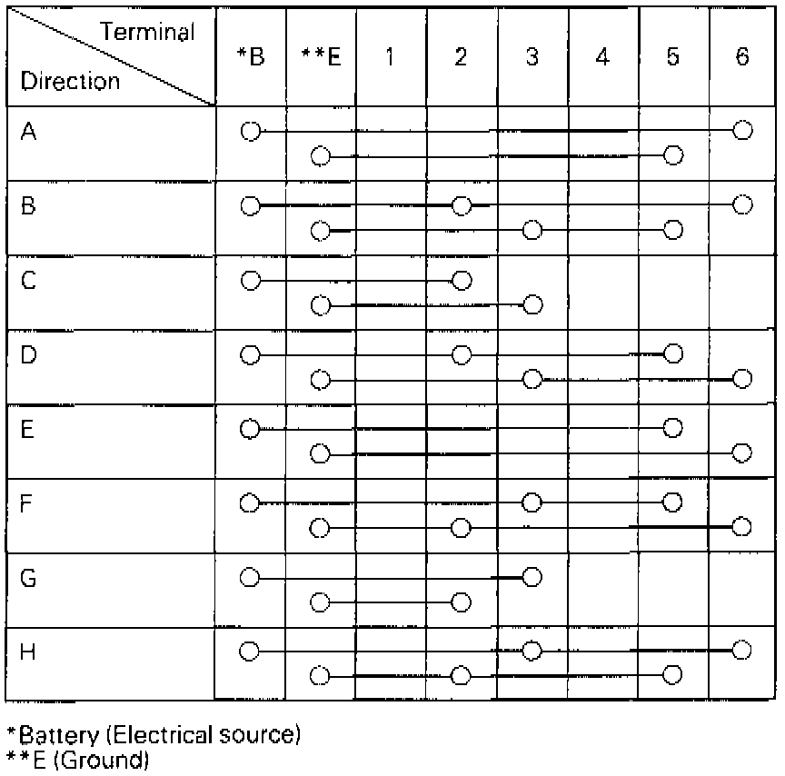 1. Confirm that the mirror moves correctly when battery voltage is applied to the mirror side terminals as indicated in the chart.