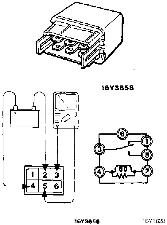 2. Check continuity between terminals 3 and 5 when the battery voltage is applied to terminal 2 and terminal 4 is grounded.