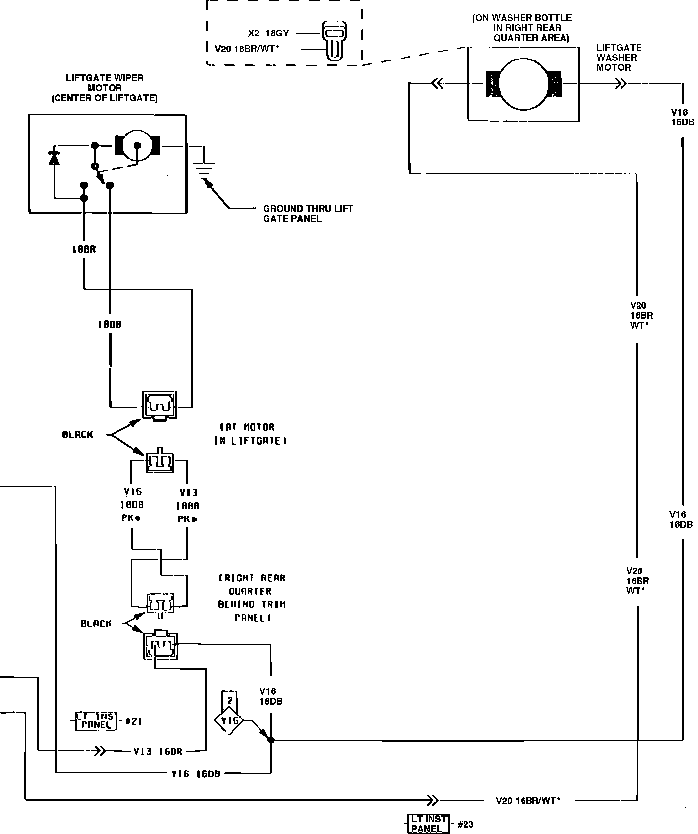 5. With ignition switch On and wiper switch On, check for battery voltage at blue wire. If battery voltage is not obtained in steps 4 and 5, inspect circuit breaker, lift gate wiper switch and wiring.