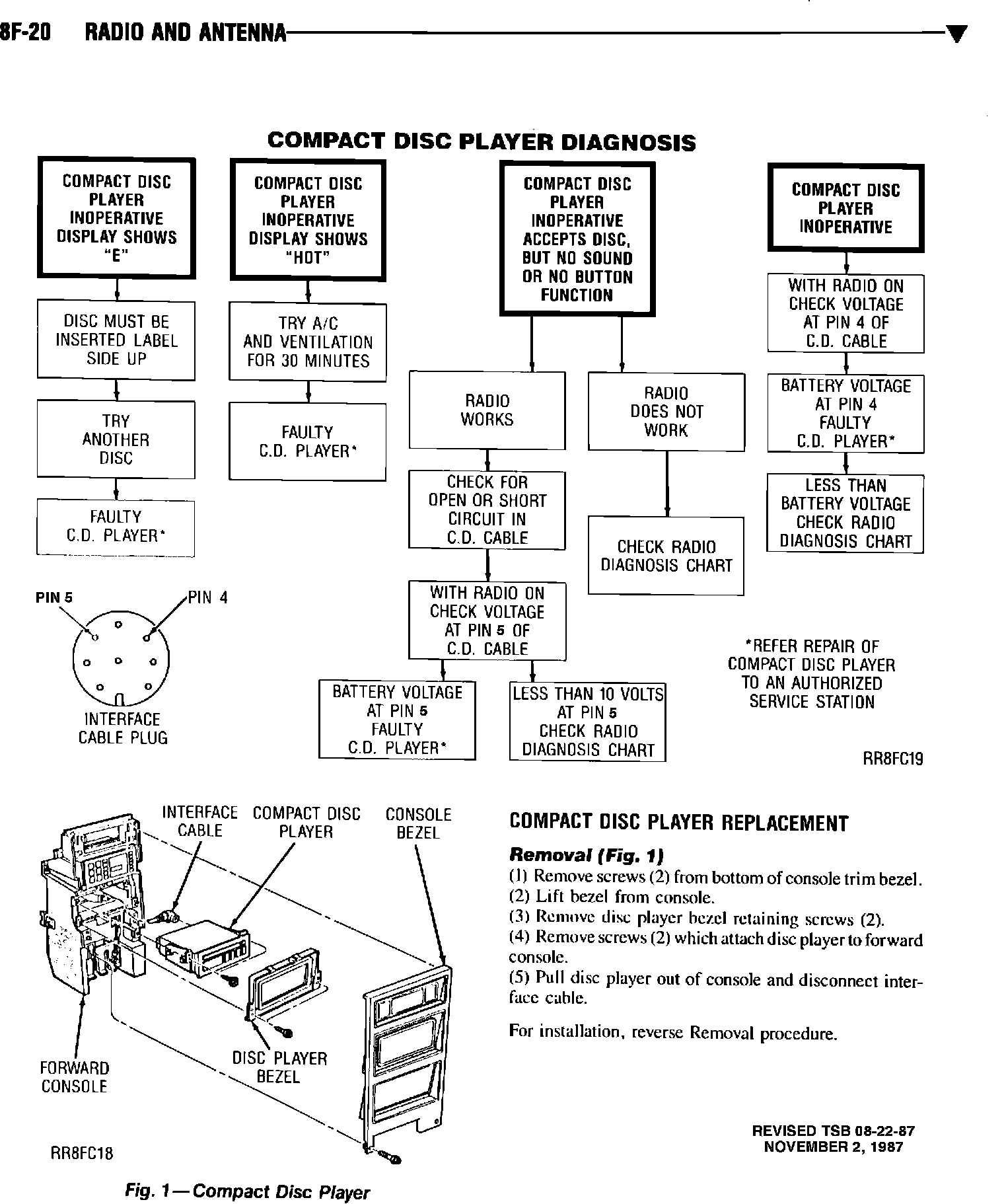 The 1988 Front Wheel Drive Car Electrical Fuel and Emissions Service Manual, publication #81-270-8003, contains an error in the compact disc player diagnostic chart. Pin 5, not pin 8, of the interface wire should be checked for voltage as part of the diagnosis.
