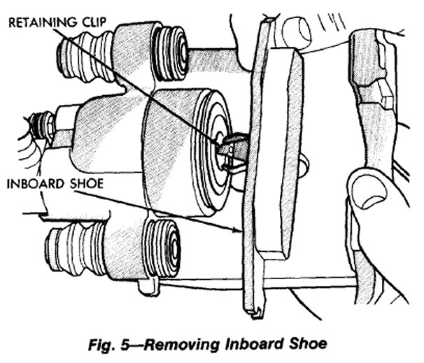 (5) Remove outboard shoe by sliding shoe off caliper (Fig. 4).