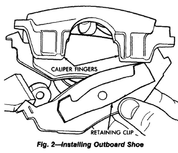 (3) Install outboard shoe by sliding retaining clip over caliper fingers (Fig. 2).