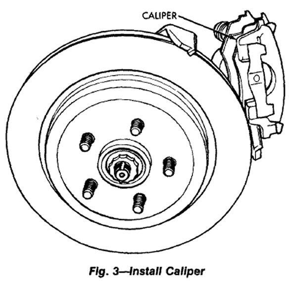 (4) Install lower end of caliper on to adapter making sure the lower tabs on shoes and the casting projections on the caliper are under the adapter rail (Fig. 3).