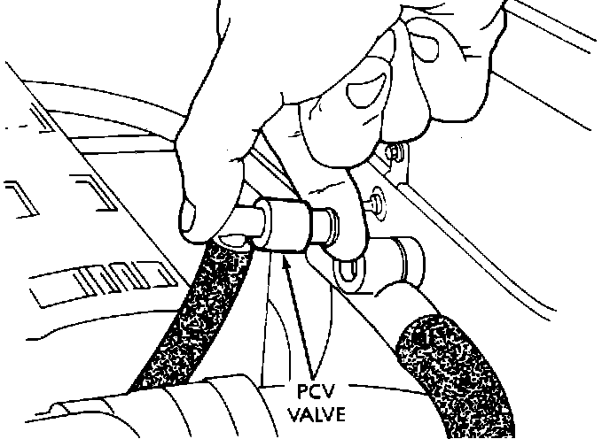 1. With engine idling, remove PCV valve from rocker cover. If valve is not plugged, a hissing sound will be heard as air passes through the valve, and a strong vacuum should be felt when a finger is placed over the inlet of the valve.