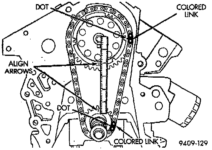 4. Align the dark colored links with the dot on the camshaft sprocket, place timing chain around crankshaft sprocket with the dark colored link lined up with the dot on the sprocket and install camshaft sprocket into position.