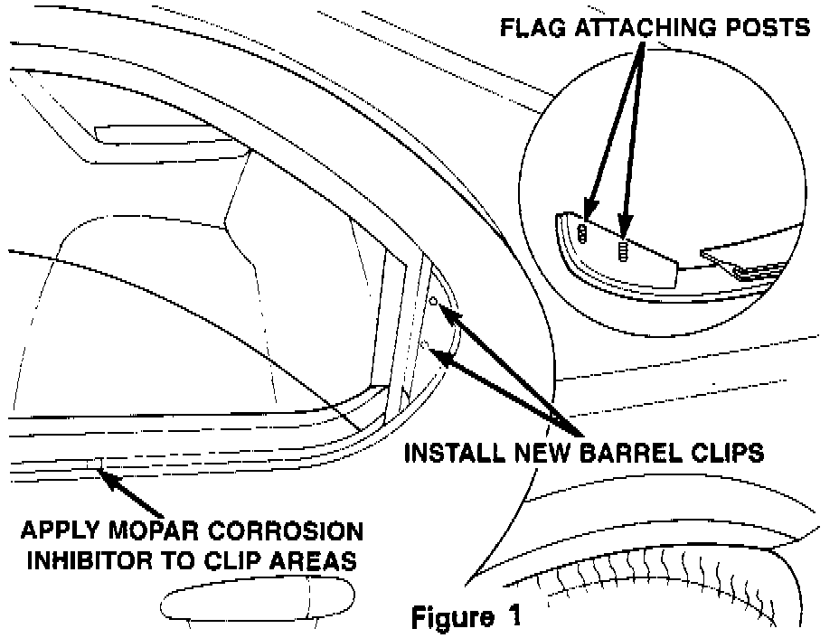 ^ Rear -- Remove the existing barrel clips from the rear door molding flag area and install provided clips (Figure 1).
